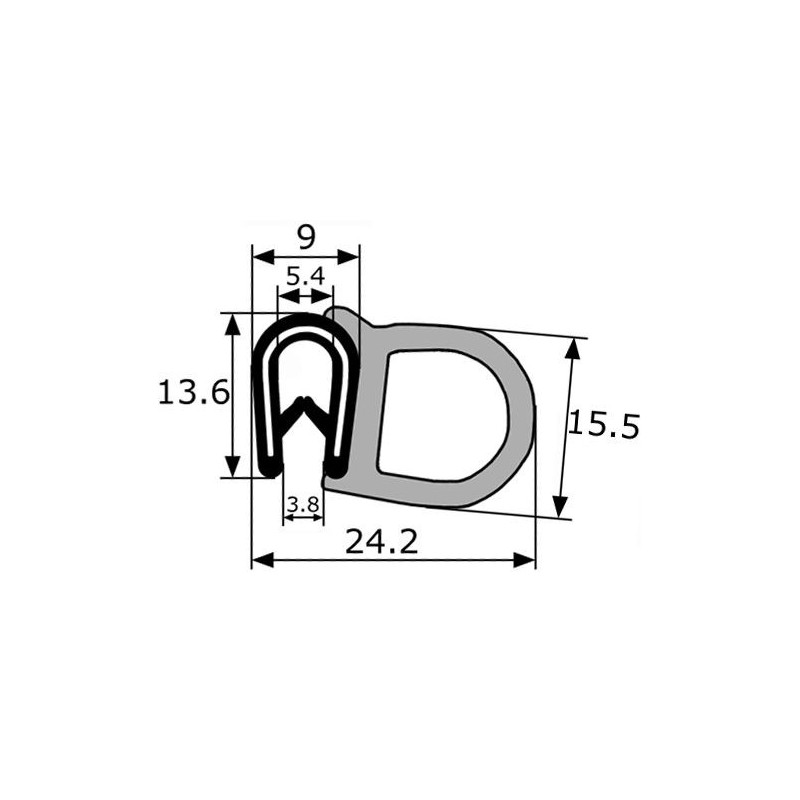 Goma de estanqueidad lateral para puertas. Medida 24x15,5mm. Adapta hasta 4mm de grosor. Protección y aislamiento ante humedad, ruido y rozamiento. Uso interior y exterior. Aplicaciones para carrocería y sector industrial. Precios por metro lineal