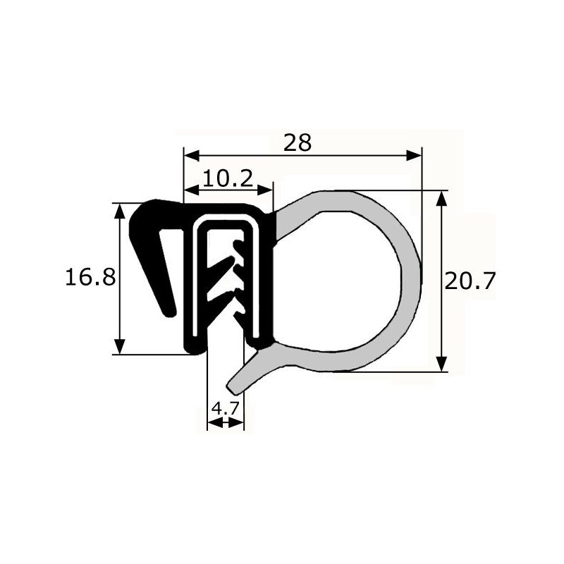 Goma de estanqueidad para puertas. Con pestaña lateral. 28x21mm. Adapta hasta 4mm de grosor. Protección y aislamiento ante humedad, ruido y rozamiento. Uso interior/exterior. Aplicaciones en industria y carrocería. Precios por metro lineal